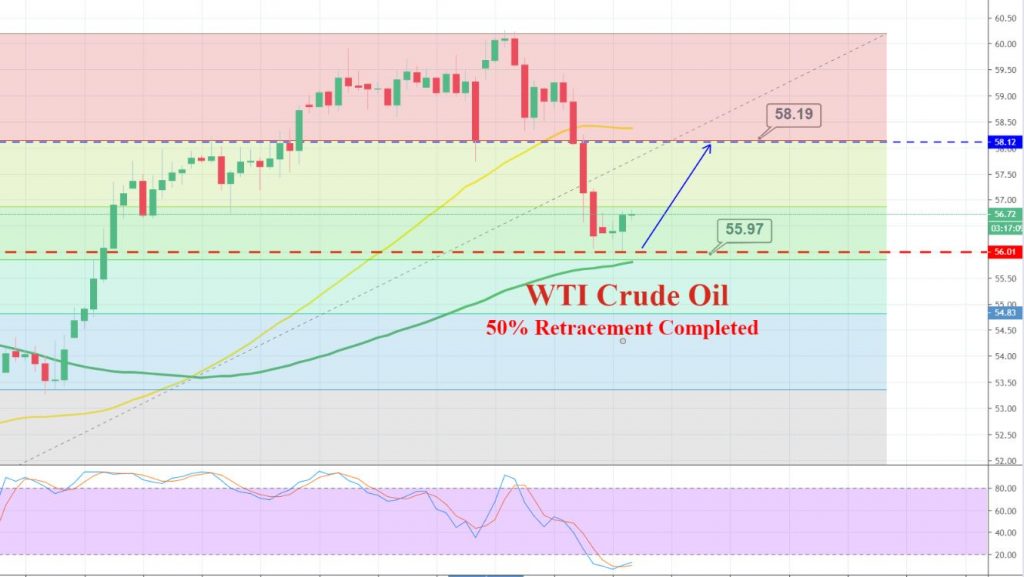 On Wednesday, WTI crude oil prices bounced slightly after an abrupt fall from 59.50 to 56.30. The sell-off came in response to the OPEC and its allies’ decision to continue production cuts; however, the investors didn’t consider it enough to counter investors’ concerns about the slowing global economy.