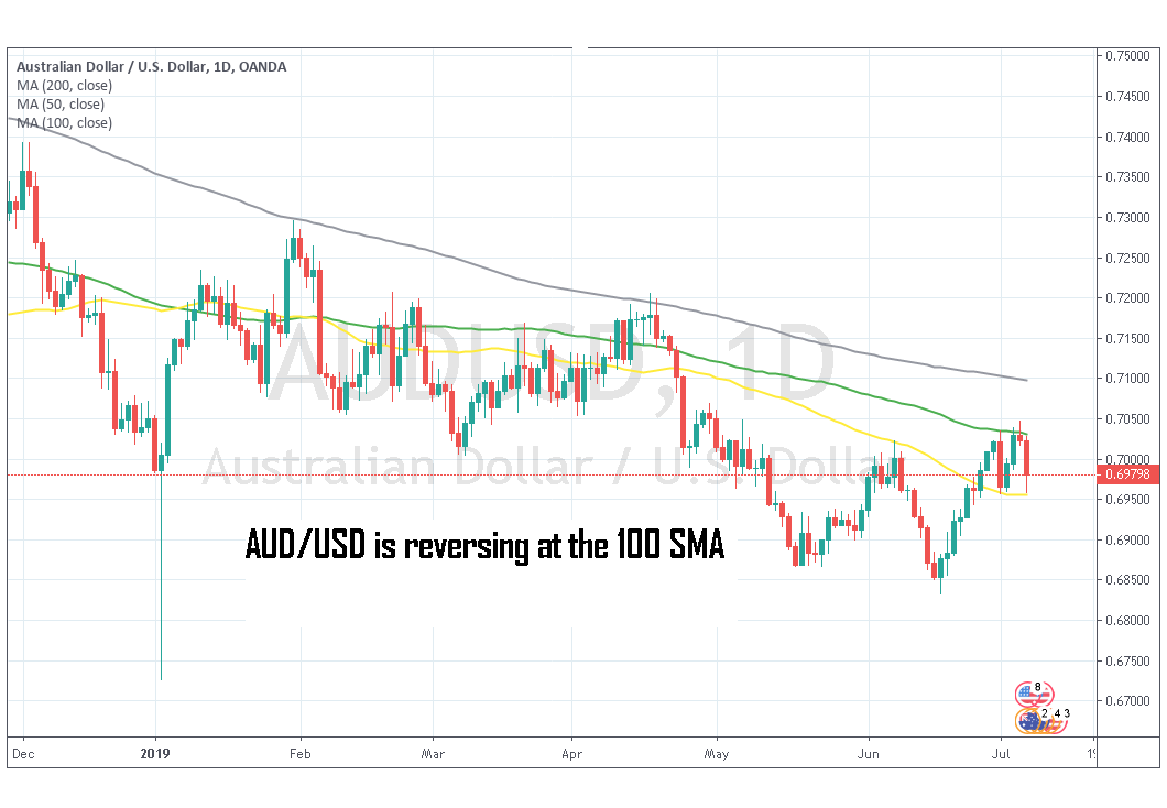 But in the second half of June, we saw a bullish reversal which turned out to be a decent pullback. The US economy also weakened considerably in recent months as the economic data from the US has shown which turned the FED pretty dovish in the last meeting, after which the odds of the FED cutting interest rates in July increased to nearly 100%. That hurt the sentiment for the USD and the Buck entered a downtrend in the second half of June which also continued into this week, as you can see from the chart above. But now the pullback higher in AUD/USD has run its course and a reversal is about to take place. We saw a reversal yesterday, but that big reversal everyone is waiting won’t be official until the 50 SMA is broken on the daily chart. Although, I think that the big reversal will happen, so let’s have a look at the options.