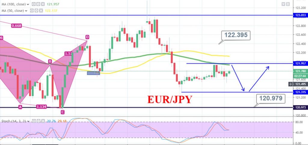 The bullish breakout of 122 can lead EUR/JPY prices towards 122.400 and a bearish breakout can extend sell-off until 120.950 today.