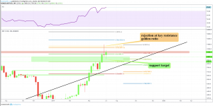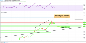 The daily RSI of Ethereum shows a bearish divergence as well, which indicates a sell-off very soon. Ethereum is currently between a resistance and support zone. If Ethereum doesn’t manage to break the resistance between $360 – $420, it will most likely retrace down to $167 – $222, where Ethereum finds major support and the golden ratio acts as an additional key support level.