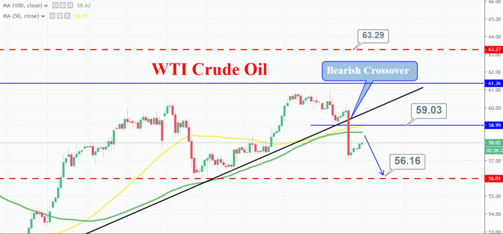 Oil prices are already below 50 and 100 periods EMA which are extending resistance at $59. It may find support around $57.20 and $56.