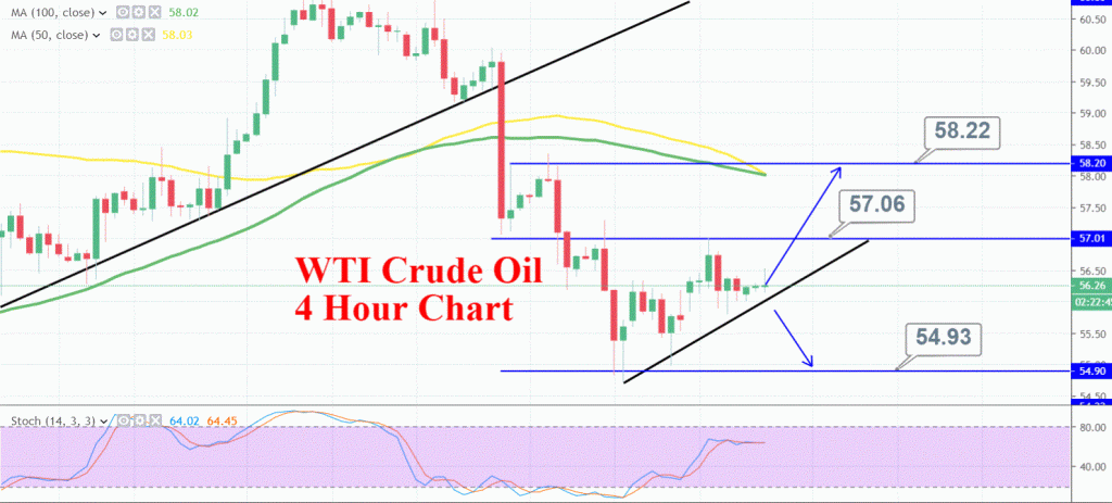 Crude oil’s lower high and lower low pattern is violated as oil isn’t following it anymore as it supports the bullish bias in oil. Black crack has crossed over the resistance level of 56.35 yesterday, but it has come back to trade at 56.25.