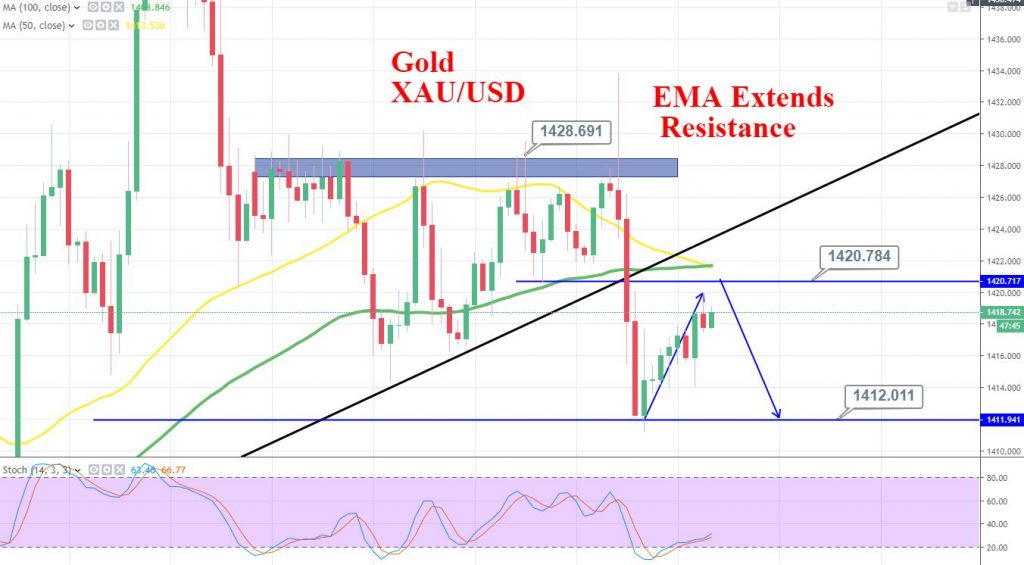 Speaking about the technical indicators, gold is trading bullish after gaining the support of around $1,411. Yesterday, the precious metal violated the descending triangle pattern at $1,420 and now the same level is likely to extend resistance to gold.