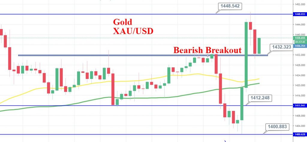 Today, global financial markets are likely to exhibit extreme volatility over the release of multiple fundamentals, therefore the same rule applies to gold. This week, gold has persistently traded sideways in a wide range of $1448 – $1400, trading as we planned throughout the week.