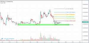 XRP could hold above $0.30 quite nicely during the previous weeks and didn’t reach down to its strong support region between $0.25-$0.29. In fact, XRP performed a series of higher lows during the past two weeks, which can be considered bullish. For now, it seems likely that XRP is heading towards the $0.37 mark at the 0.382 fib resistance; however, it first needs to break the small resistance at $0.34 to continue its uptrend.