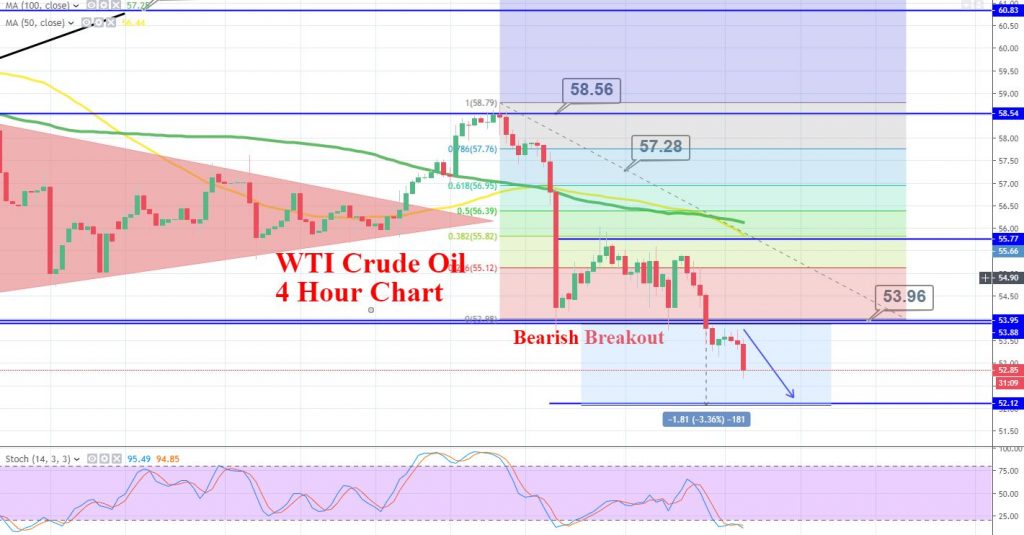 Crude oil has violated a long-held sideways range of 55.70 – 54. On the lower side, oil has an open room to go after 52.15.