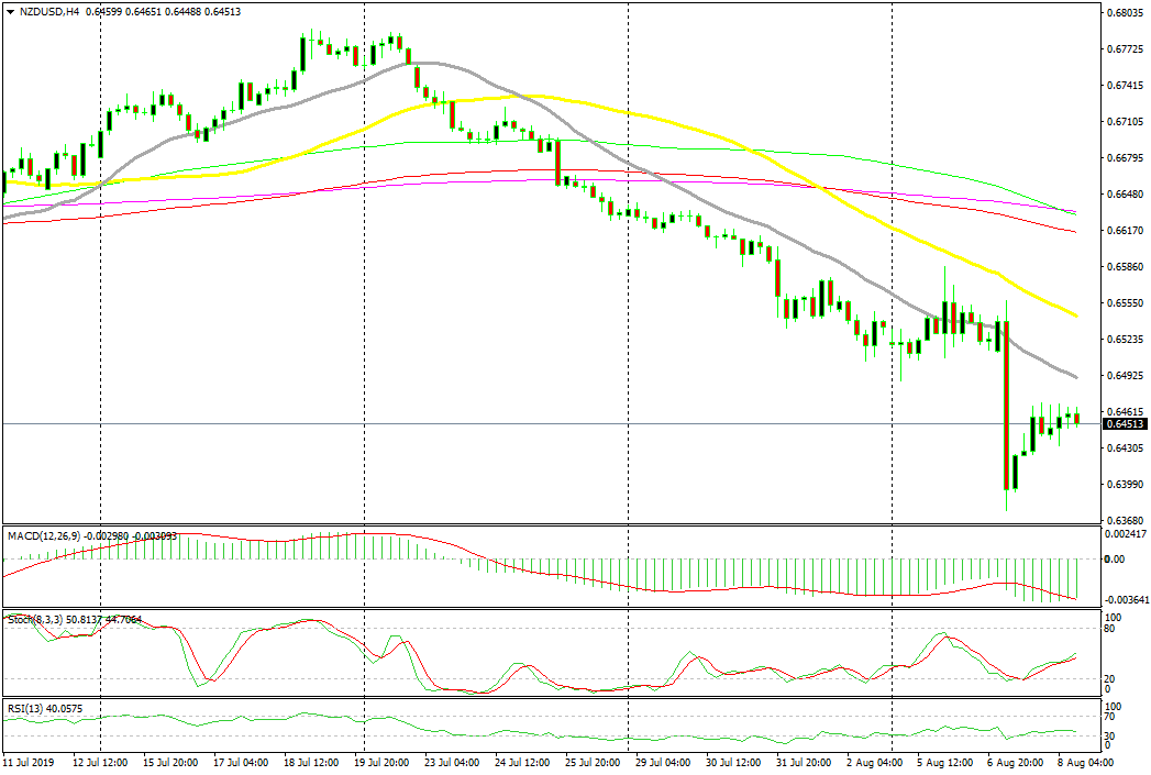 NZD/USD turned really bearish about three weeks ago together with the Aussie as the sentiment deteriorated in financial markets. This pair has lost more than 400 pips during this time and the downtrend picked further pace yesterday after the RBNZ cut interest rates by 0.50%. The RBNZ left the door open for more easing in the coming months, so fundamentals are pretty bearish for the Kiwi, as the trade war escalates further. This pair has retraced higher but the retrace seems almost complete now on the H4 chart. Buyers are not making new highs and the recent candlesticks point to a bearish reversal. We went short on this pair but the reversal will likely come when the 20 SMA (grey) catches up with the price.
