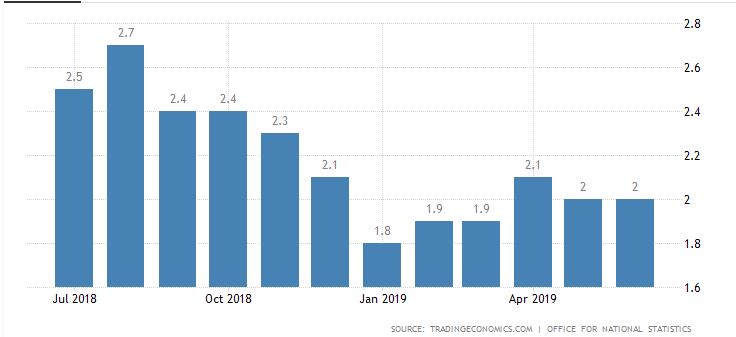 The Office for National Statistics is due to report the British inflation rate. The annual inflation rate in the United Kingdom was at 2% in June 2019, consistent with the preceding month and in line with market expectations. Cost of food and non-alcoholic liquors grew considerably while prices decreased for transport and housing & utilities.