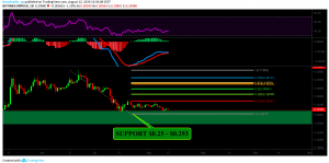 XRP was rejected by the 0.236 fib level multiple times and is heading down to the support zone between $0.25 and $0.29. For now, XRP will most likely continue to decline. Additionally, the MACD is about to cross bearishly and the histogram is ticking lower while the RSI is nearing oversold regions. XRP should bounce towards the upside in the next couple of weeks. However, for now it seems likely that XRP is going for a lower low.