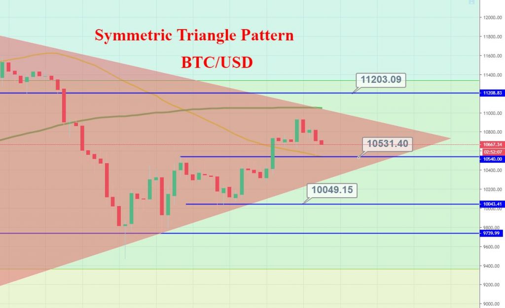 BTC/USD is also experiencing a lack of volatility, which is why it’s stuck in the symmetric triangle pattern. As anticipated, bullish power dominated to push BTC/USD towards 10,900 and even higher near 11,000 resistance area.