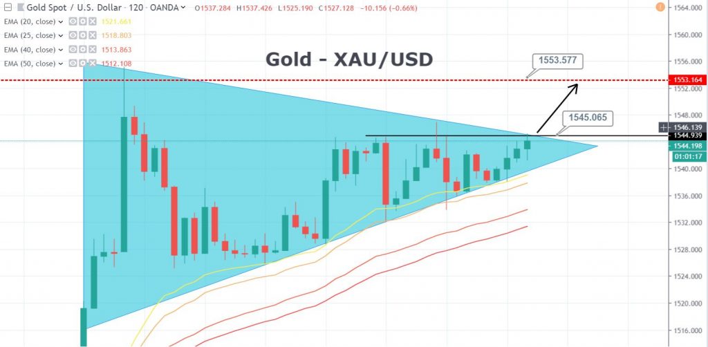The risk-on sentiment is still on amid the trade war between the US and China. With that, gold continues to stay supported over the boosted safe-haven appeal. Gold seems bullish above 1537 as it’s been holding above this level since US session. At the same time, 14 periods EMA is signaling a bullish trend, while supporting gold around 1537. Immediate resistance is at 1544 and closing above this level is likely to bring more buyers until 1554.