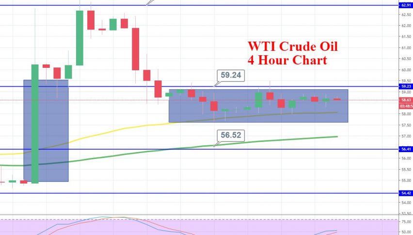On the technical side, crude oil is trading in a narrow range of 59.25 – 58 area. Crude oil has closed a series of neutral candles which are signaling indecision among traders. Besides that, the bullish breakout of 59.30 level can lead crude oil prices towards 60.50 and 62 areas.