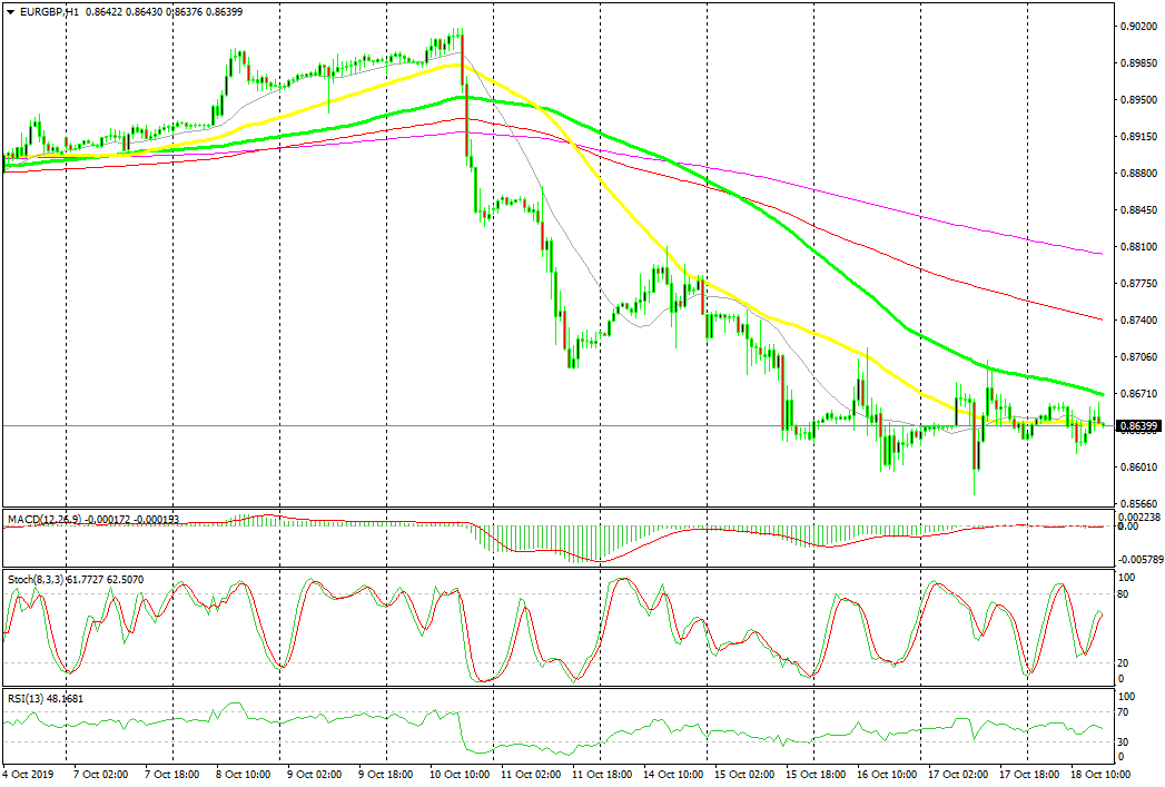 EUR/GBP has been bullish for months, but it turned bearish last week after rumours of a possible Brexit deal. The rumours are still being heard and despite the uncertainty and contradiction, the situation has improved for the GBP. The 50 SMA was doing a good job on the H1 chart, providing resistance on pullbacks higher. It was broken yesterday, although the 100 SMA (green) turned into resistance and it is reversing the price lower for the second time today. We just went short on this pair, after the last two candlesticks closed as a doji and an upside-down hammer, which are reversing signals.