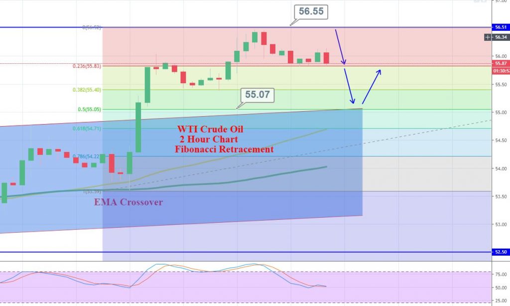 On the 2 hour timeframe, crude oil has entered the overbought zone, suggesting chances of bearish retracement. WTI crude oil is facing immediate resistance at 56.55 area along with an immediate support level of 55.85.