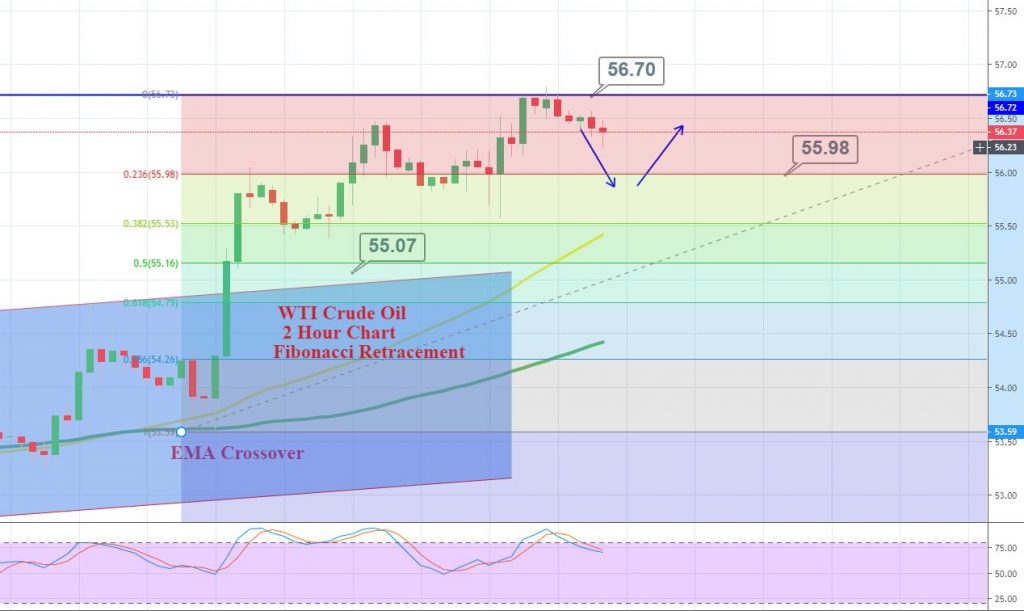 Crude oil has entered the overbought zone, suggesting chances of bearish retracement. WTI crude oil is facing immediate resistance at 56.55 area along with a direct support level of 55.85.