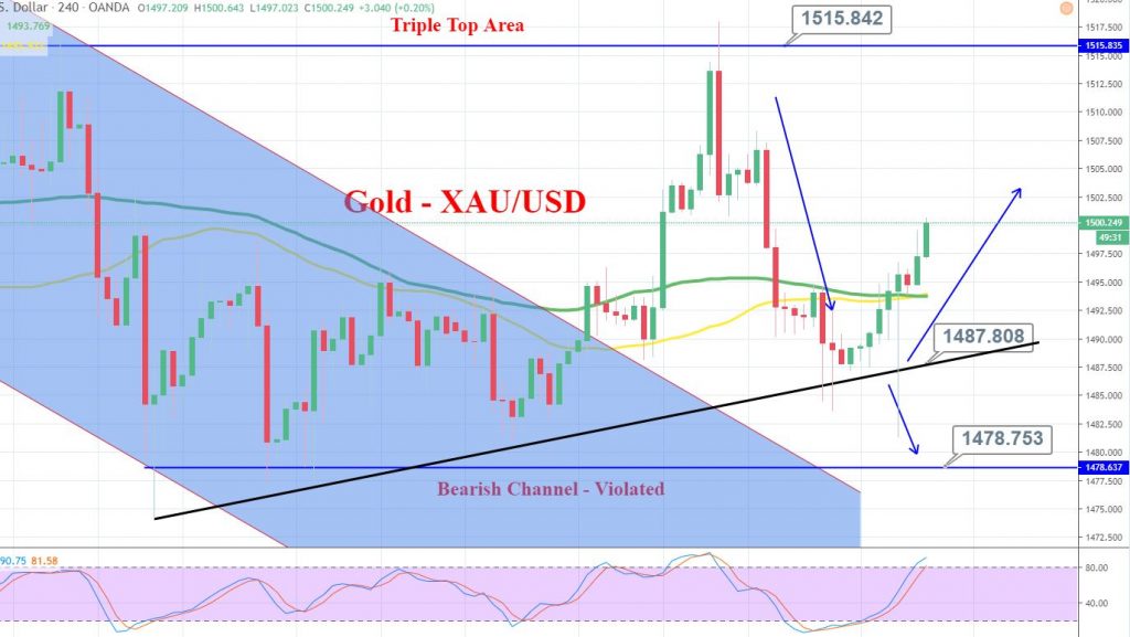 The precious metal gold has already violated the triple top resistance level of 1,494. Closing of hourly candles above 1,494 confirms the violation of the level, and technically, Gold should continue to trade bullish until 1,503 and 1,507. In case, Gold decides to trade bearish, the very first hurdle on the lower side is likely to be at 1,494 where the bearish breakout can extend sell-off until 1,483 area.