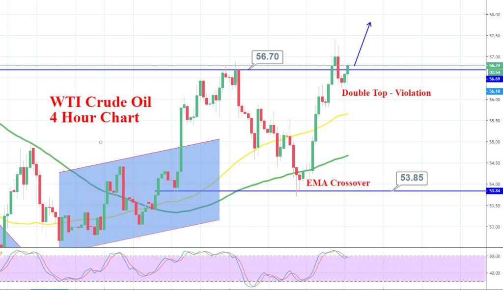 Technically, crude oil is crossing over the double top resistance level of 56.70, and closing of 4-hour candles above this level can drive the bullish trend in WTI prices.