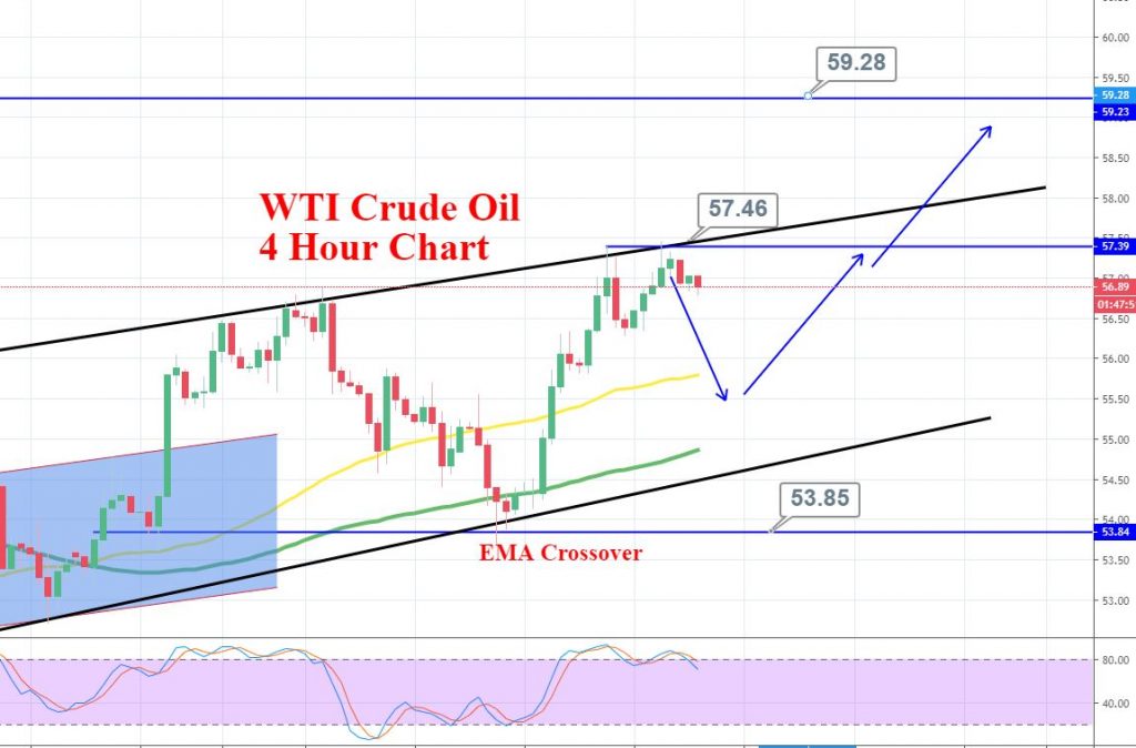 On the 4-hour chart, WTI crude oil is trading in a full bullish channel. The upper bullish line of the channel is extending resistance around 57.45 area.