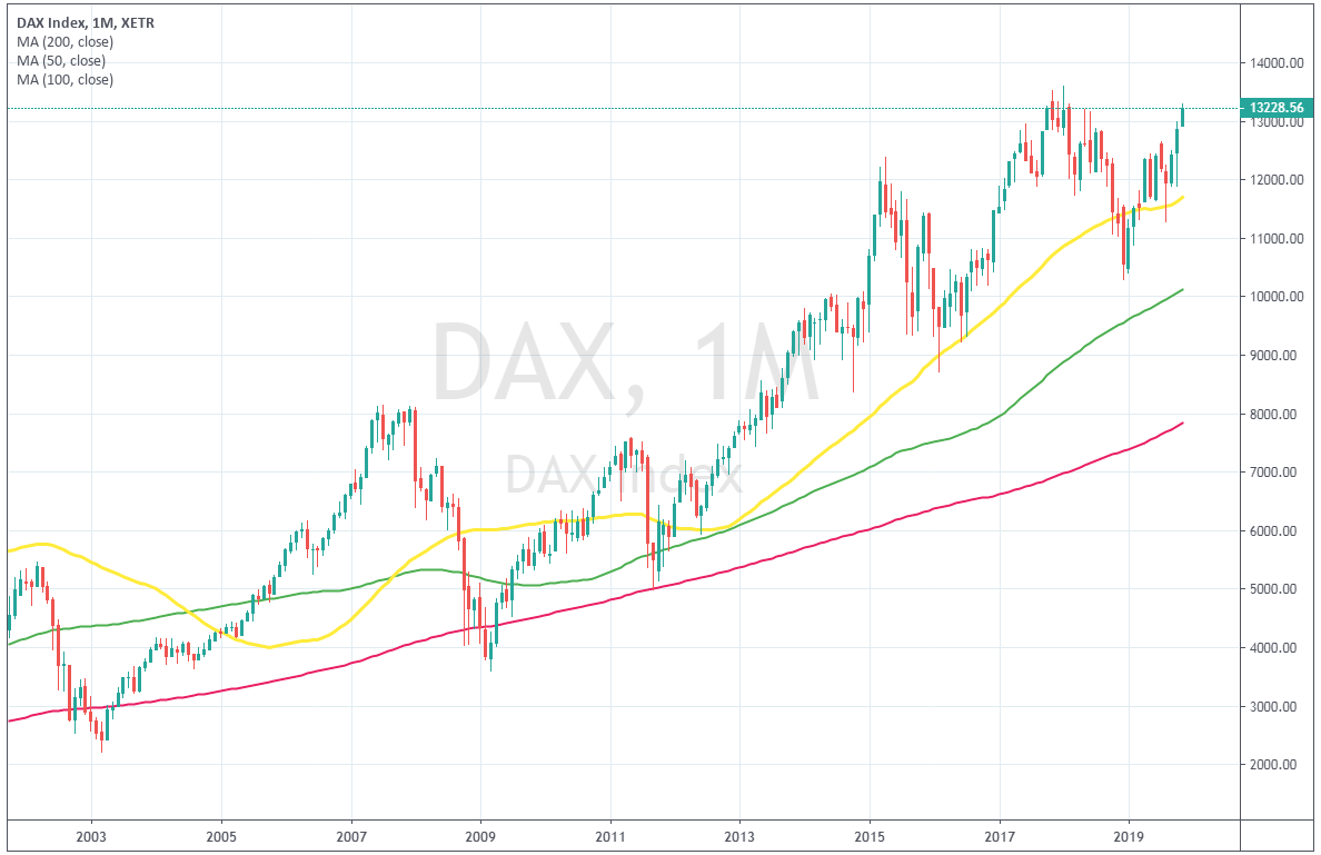 As you can see from the monthly chart of the main German index DAX 30, the trend has been bullish as far back as the chart shows, in 2003. If you scroll further back on your platform, you will see that the trend has been bullish throughout the history. As the saying goes in forex, the trend is your friend.