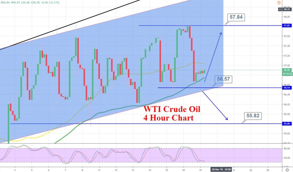 Crude oil prices are trading above the triple bottom support level of 56.50, and closing of 4-hour candles above this level was signifying..