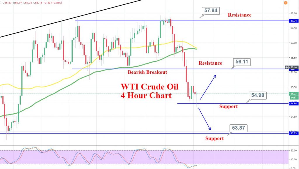 Technically, WTI crude oil prices have dropped to 55 support area in the wake of rising crude oil inventories. It’s forming a Doji pattern above 55 area, which may help to boost oil prices until 55.50 and 55.75.