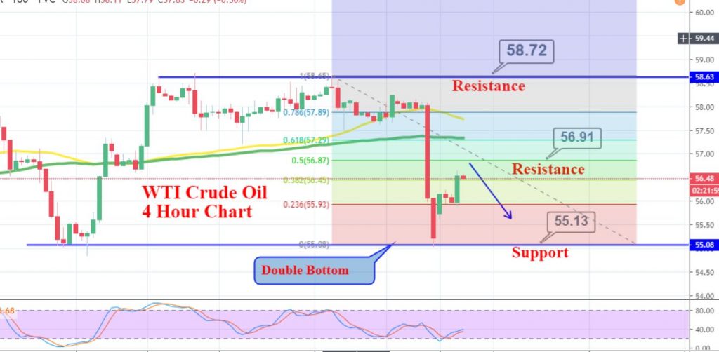 WTI crude oil has faced a double bottom support level of around 55.08 on the 3-hour chart. Closing of candles above this level is suggesting chances of a bullish retracement.