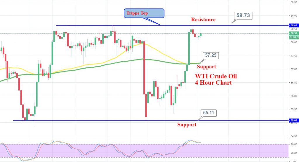 WTI crude oil prices are consolidating around 58.65 resistance area. Crude oil has entered the overbought zone as we can in the Stochastic and bearish retracement seems imminent. On the lower side, the immediate support is likely to be found around 58. Where, the bearish breakout of 58 can trigger further selling until 57.55 area.
