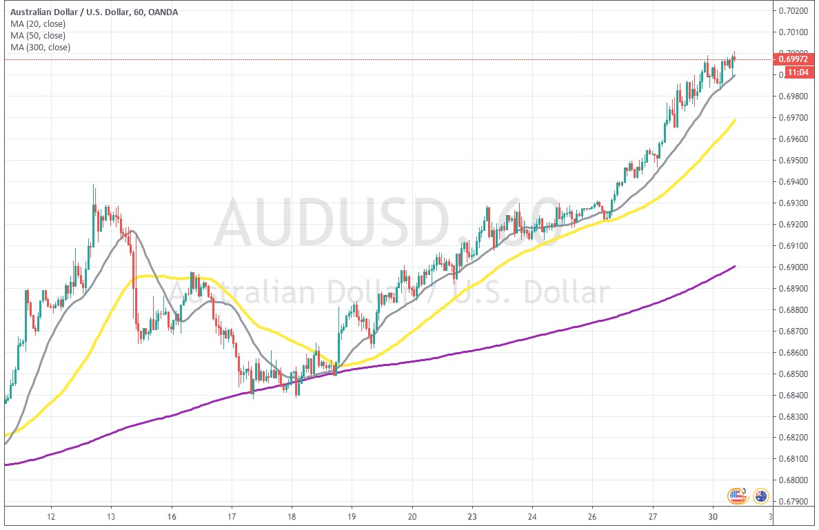 AUD/USD has been bullish since the beginning of this month, as the USD turned bearish, on softer US ISM manufacturing report, which showed that this sector fell deeper into contraction during November. The upside momentum faded and in the third week this pair retraced lower. But, the sentiment improved further after US and China agreed on Phase One deal, helping risk assets, such as the stock markets and commodity Dollars. As a result, AUD/USD has been bullish for about a week. The uptrend has been pretty straightforward. The price has bean leaning on the 20 SMA (grey) on the H1 chart, which has been providing support on pullbacks and pushing the price higher. This shows that the trend is pretty strong. The other moving averages have been helping as well, when the retrace was deeper, so they are pushing this pair higher.