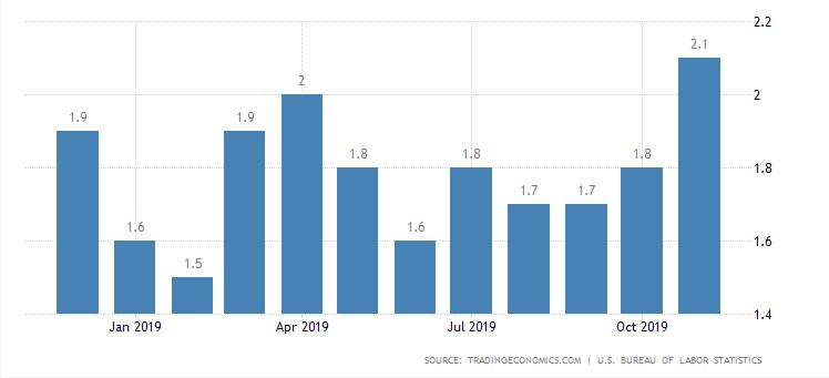 The US annual inflation rate accelerated to 2.1% in November 2019 from 1.8% in the prior month and above the market forecast of 2.0%. It’s the highest inflation rate since November 2018, as food inflation was slight while energy prices sank at a much slower pace.