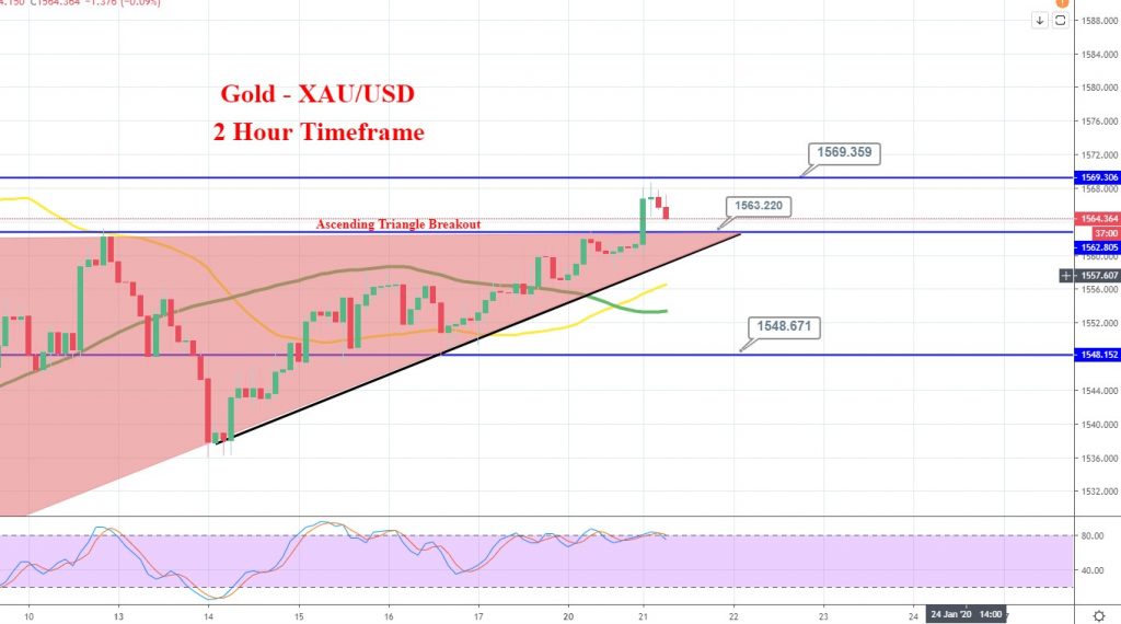 The precious metal gold soared to trade higher around 1,566 levels in the wake of risk-off sentiment. Investors seem to fear and invest in safe-haven assets following China’s coronavirus news. Gold has violated the ascending triangle pattern at 1,563, and it may surge higher to target 1,569 level. The metal may find immediate support around 1,563 level today while the resistance stays at 1,569 and 1,574.