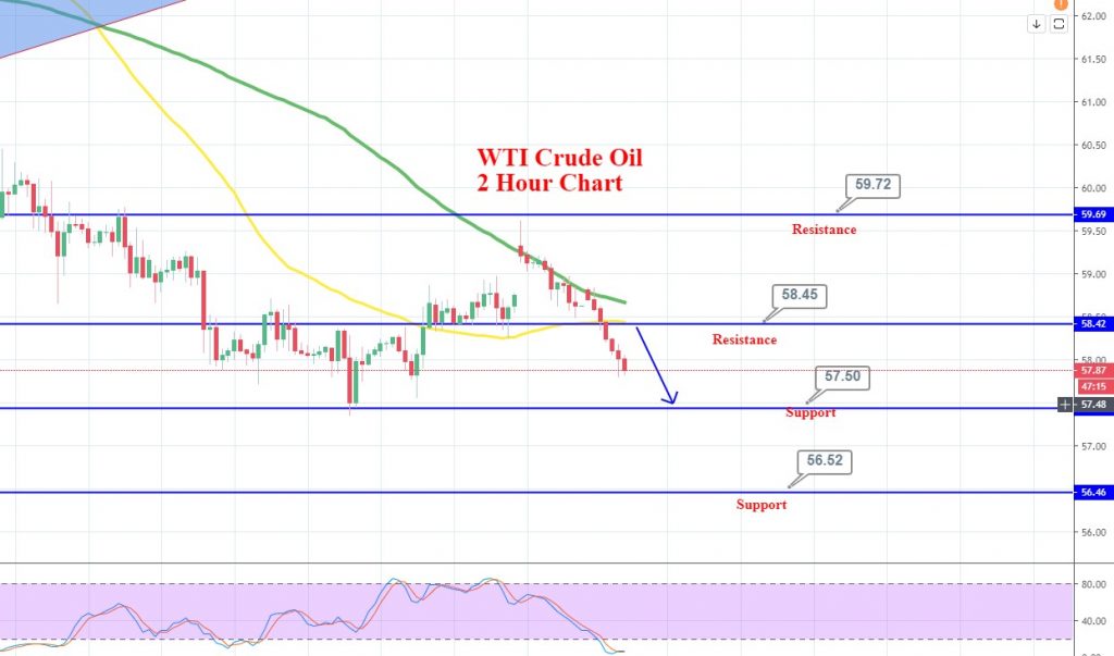 WTI is trading at 57.86, having immediate support around 57.40, while resistance stays around 58.45. The RSI is dramatically oversold, but the trading sentiment still remains bearish as WTI has formed three black crows on the 2-hour chart. Let’s look for selling trades below 58 to target 57.40. Good luck!