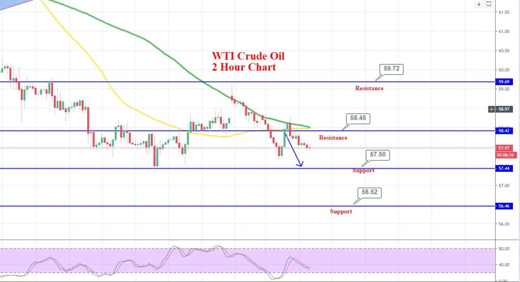 WTI is trading at 57.86, having immediate support around 57.40, while resistance stays around 58.45. The RSI is dramatically oversold, but the trading sentiment still remains bearish as WTI has formed three black crows on the 2-hour chart. Let’s look for selling trades below 58 to target 57.40. Good luck!