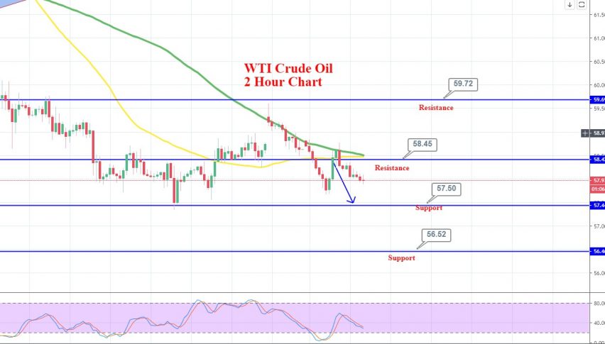 WTI is trading at 57.86, having immediate support around 57.40, while resistance stays around 58.45. The RSI is dramatically oversold...