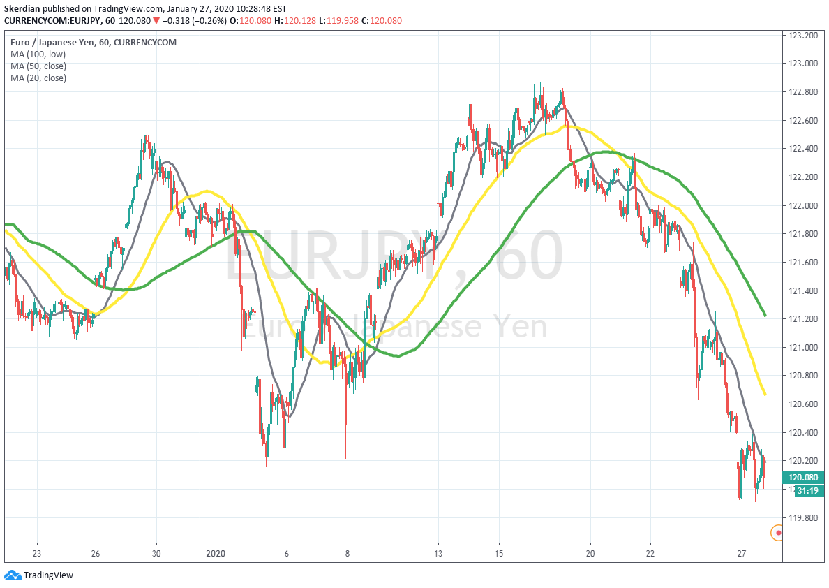 EUR/JPY has also had quite a roller-coaster ride in the last two months. In the first week of this year, we saw a 00 pip dive lower, as tensions between US and Iran increased, but then buyers came in after the tensions abated and they sent the price nearly 300 pips higher. But, the outbreak of the corona-virus in China has turned the sentiment negative again, sending risk assets lower and safe havens higher. The Euro as a risk currency and the JPY is a safe haven asset, so this pair has had a double reason to turn bearish in the last two weeks.