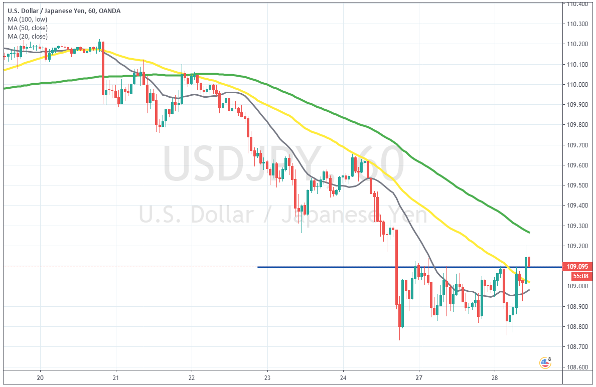 The 50 SMA in particular has been doing a great job in providing resistance and pushing the price lower for this pair. Earlier today we saw a retrace higher and decided to go short at the 50 SMA (yellow) on the H1 chart, around 109, which seems to have formed a resistance zone above it. Buyers managed to push above the 50 SMA after the impressive US CB consumer confidence, but the upside seems exhausted now and the price is coming back down.