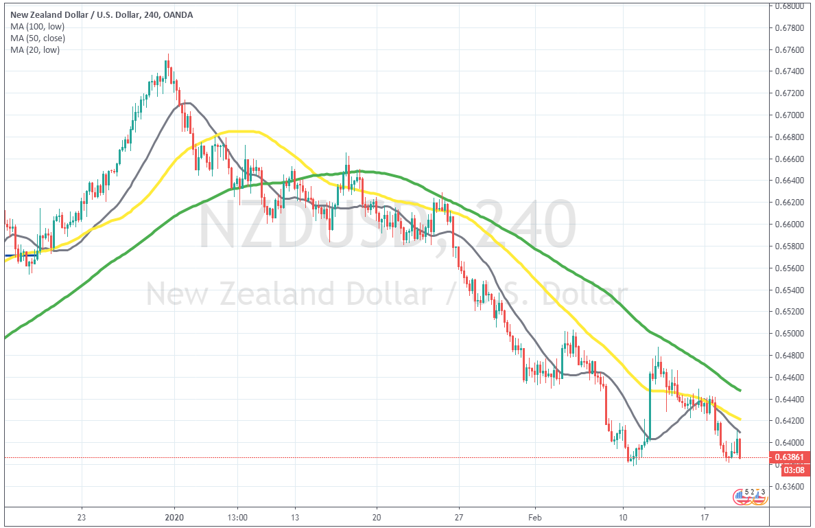 NZD/USD turned bearish at the beginning of this year, after having retraced higher in the last three months of last year. But, good times ended with the end of Q4 in 2019 and once the new year began, the retrace higher ended and the price turned bearish. NZD/USD has remained bearish since then, losing nearly 400 pips, as the tensions between US and Iran at first, then the coronavirus epidemic hurt the sentiment in financial markets. During this time, moving averages have turned into resistance and have reversed the price lower many times.