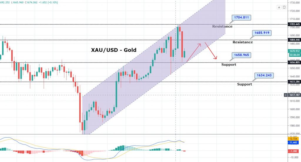 Today in the early Asian session, the safe haven metal prices failed to maintain its bullish trading above $1,700 per ounce level for the first time since late 2012 on Monday and dropped to $1,662.80, down 0.73%. As the press time, gold is currently trading at $1,670.01 and consolidates in the range between the 1,657.68 – 1,703.10.