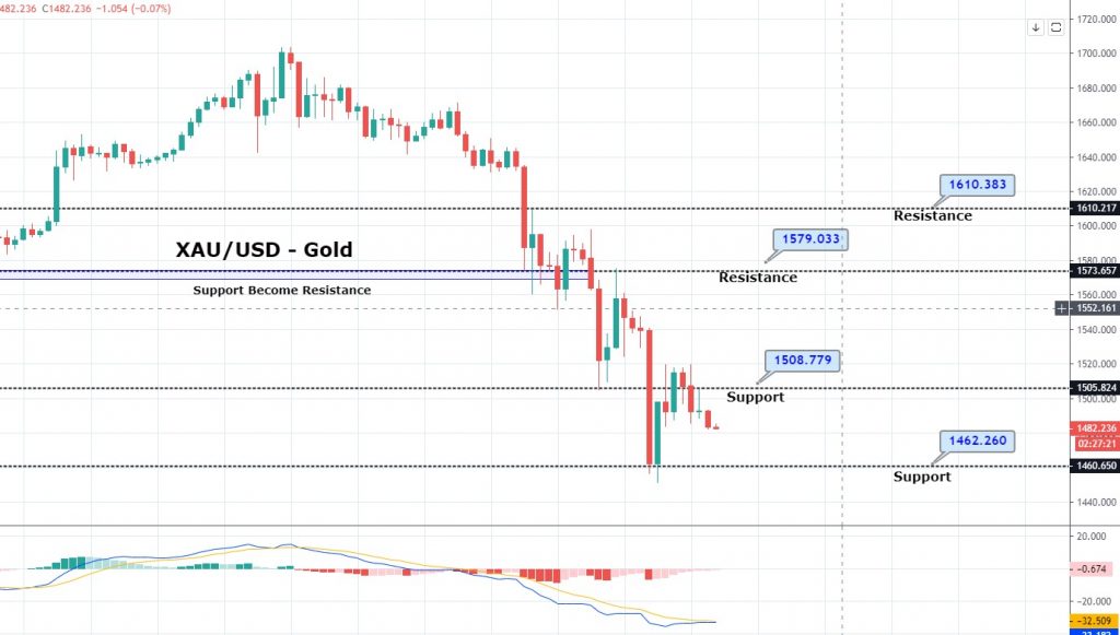 At the starting of Tuesday’s Asian session, the safe haven metal prices have recovered from the multi-week low and registered 0.36% gains to $1,512 earlier on the day despite the risk-reset in the market. As of writing, gold is currently trading at 1,488.15 and consolidates in the range between 1,482.90 – 1,519.20.