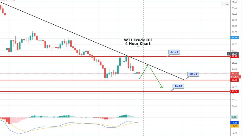The risk-off market sentiment and US travelers’ ban news from Japan are also weighing onoil prices. At the moment, WTI crude oil prices are currently trading at 22.66 and consolidate in the range between the 20.81 and 23.23. WTI rose 0.6% to trade at $22.77 per barrel, erasing some early losses that had sent the contract falling more than 8%.
