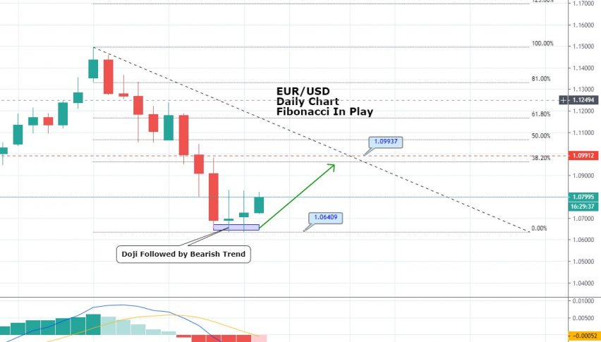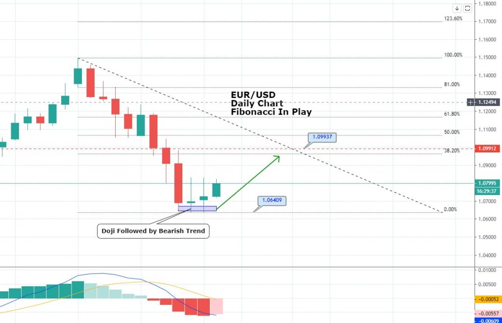 EUR/USD is currently trading around 1.0770, and technically, the pair has formed a bullish setup. On the daily chart above, the pair has closed a Doji candle followed by a solid bearish trend, which signifies odds of strong bullish reversal. On the higher side, EUR/USD is likely to head north to complete 38.2% Fibonacci retracement at 1.0960 while support continues to stay around 1.0720. The idea today is to stay bullish above 1.0723 to target 1.0809 and 1.0912.