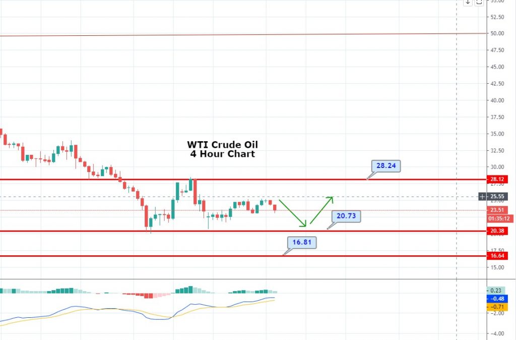 WTI crude oil prices continued their previous recovery rally and rose 3.92% to $24.95 after the American Petroleum Institute (API) reported a decline in the US crude oil stockpiles. WTI crude oil prices are currently trading at 24.66 and consolidate in the range between the 24.21 and 25.22.