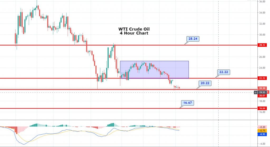 WTI crude oil prices dropped to the fresh one-week low of $19.92 because the intensifying coronavirus fears continue to hurt the demand for oil. The ongoing price war between Saudia Arabia and Russia continues to weigh on oil prices. At press time, WTI crude oil prices are currently trading at 20.34 and consolidate in the range between 19.92 and 20.91.