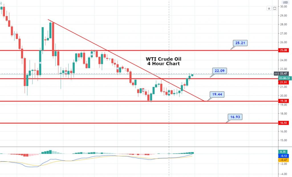 WTI crude oil prices were flashing green and trading above the $22.55 handle before reversing below the $22 handles. Oil prices recently got support from rising hopes for a truce between Saudi Arabia and Russia in their ongoing price war. As of writing, WTI crude oil prices are currently trading at 22.00 and consolidating in the range between 20.77 and 22.55.