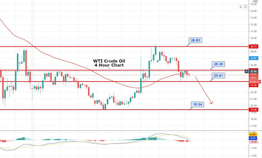WTI crude oil prices were flashing green and rose 4.5% to $25.00 from sharp losses during the previous session mainly due to multiple positive clues from the US. The strong expectations of further stimulus also keep the market stable. It should be noted the crude oil earlier ignored a rise in inventory figures from the American Petroleum Institute (API) and the risk-off market sentiment. Crude oil prices are currently trading at 24.47 and consolidating in the range between 24.20 and 25.28. The US Crude Oil WTI futures recovered from their loss of 3.57% and jumped 5.12% to $24.84.