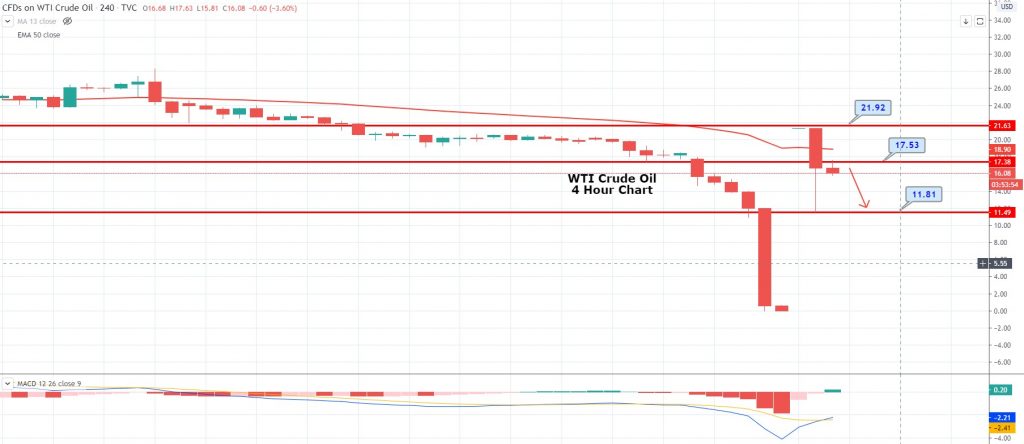 Crude oil’s May contract faced a massive dip as its prices fell into negative zone yesterday for the first time in history. However, the spot prices are trading at 17.20, supported above the level of 11. Violation of this level is likely to drive sharp selling in the market, and technically, this opens room for selling until 11 and 8 while resistance holds around 17.36 today.