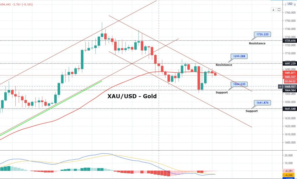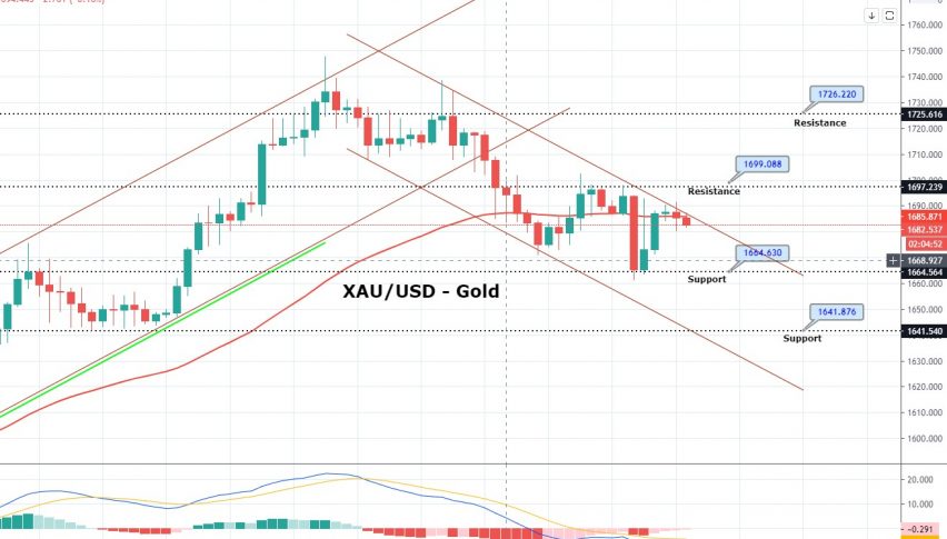Technically, gold is bouncing off above a strong support area of 1,672 to trade around 1,685 level. Closing of candles below 1,701 levels..