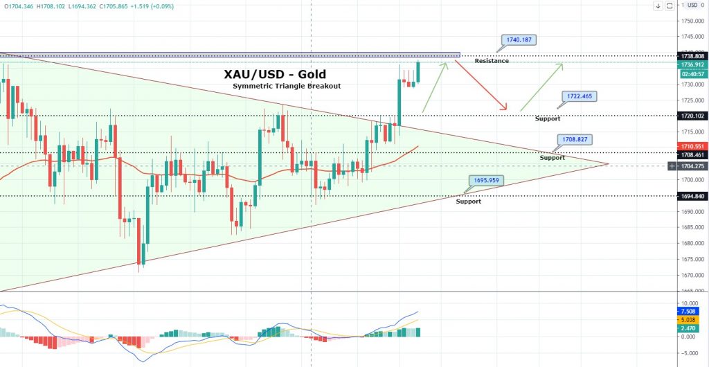 Gold broke out of the symmetric triangle pattern, which was providing resistance at 1,718, and now it's trading bullish at 1,735. The recent