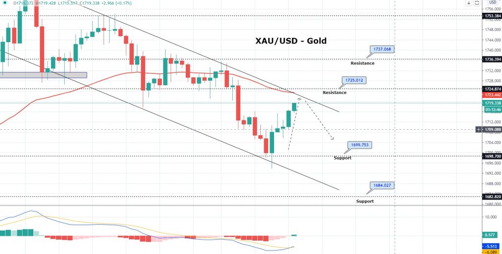 Gold prices traded in line with our forecast to help us secure 80 pips yesterday. Currently, the precious metal is heading north towards the resistance area of 1,723, which is extended by the downward channel. On the 4 hour chart, the precious metal has also closed a bullish engulfing pattern, which is suggesting chances of buying until 1,725 area. While the 50 EMA will be there to extend resistance at the same level of 1,725, let’s look for selling blow 1,723/25 area today.