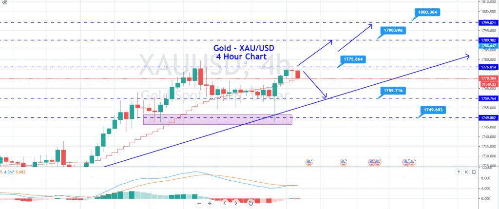 At the moment, the yellow metal is trading at 1,767 level, staying right above a support level of 1,760. Over this level, the precious metal gold can lead the XAU/USD prices towards 1,773 and 1,778 while support continues to hold around 1,767 and 1,758. Let’s focus on 1,778 levels, and violation of this will drive movement in the market. Stay tuned for trading signals and more trade ideas today. Good luck!