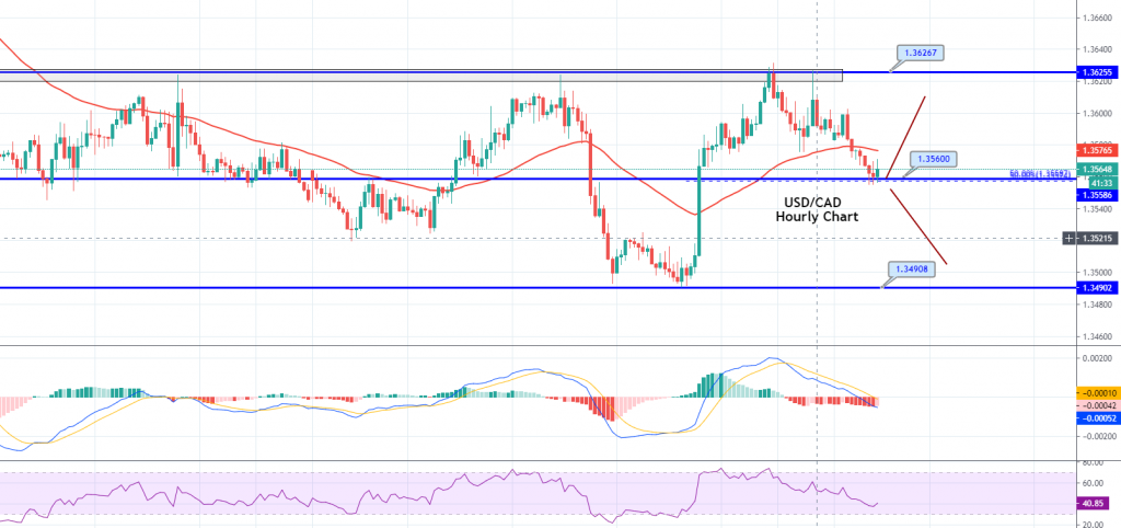 The USD/CAD pair is trading with a bearish bias at the 1.3565 level, testing the double bottom support level of 1.3560. A bearish breakout.